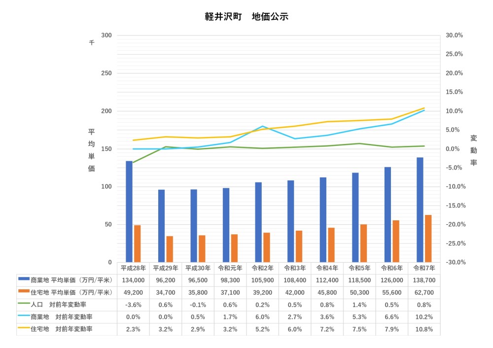 東信地域の地価動向 トップページ 東信地域の地価動向 2025年10月1日(水) 2025年 軽井沢町の地価動向 ※ 地価公示価格(R7年1月1日)当町の地価動向は、引き続き高騰を続けており周辺部に需要が拡散している。ただ、北向きの傾斜面の厳しい別荘地の動きは緩慢である。 PDFファイル※ 地価調査価格(R7年7月1日)軽井沢町の地価動向は、地価公示と同様の傾向で「供給<需要」の状況続いており周辺部に拡散して、特にしなの鉄道の「信濃追分」駅及び隣接する御代田町方面にも波及している。 PDFファイル 東信地域の地価動向一覧へ