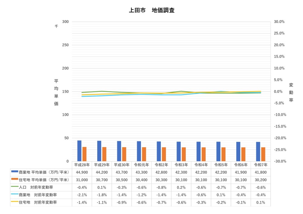 東信地域の地価動向 トップページ 東信地域の地価動向 2025年10月1日(水) 2025年 上田市の地価動向 ※地価公示価格(R7年1月1日) 中心市街地でのマンション価格が高騰し周辺住宅地の需要を喚起している。住宅地は、以前と同様に市街地周辺の染屋台、御所、諏訪形等の住宅地も堅調な動きを示して需要の二極化が鮮明に成って居る。 PDFファイル※地価調査価格(R7年7月1日)マンション需要が旺盛で市街地の地価を牽引している。又、市街地と農村部との格差が大きく二極化が鮮明に成ってる。 PDFファイル 東信地域の地価動向一覧へ