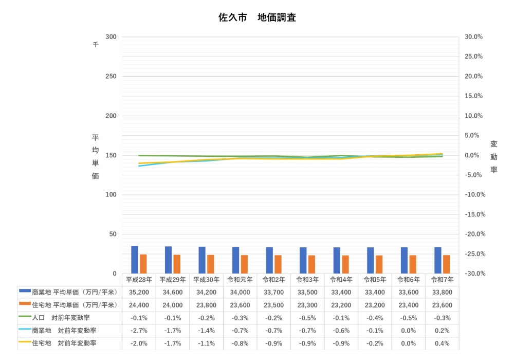 佐久市の住宅需要は、都心に直結する通勤圏の様相を示しつつ新幹線「佐久駅」を中心に地価が形成されている。又、佐久南土地区画整理事業地内に大型店、マンション等が建設されて街並みが大きく変化している。ただ、その他の既存の商業地域、合併した旧町村部は旧態依然の状況が続いており引き続き下落傾向で推移。